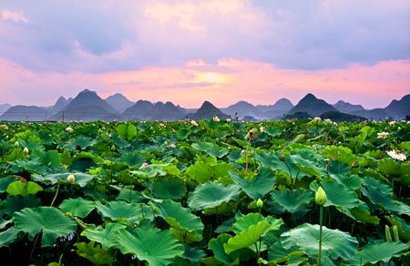 普者黑,为彝族语言,意为“盛满鱼虾的湖泊”, 湖水清澈,游鱼可数。登高眺望,似21公里长的一串珍珠,熠熠闪亩荷花洒在水面,荷叶翠绿,花色多样,亭亭玉立,荡舟穿行其间,清香扑鼻,令人陶醉,如置身于诗画之中......