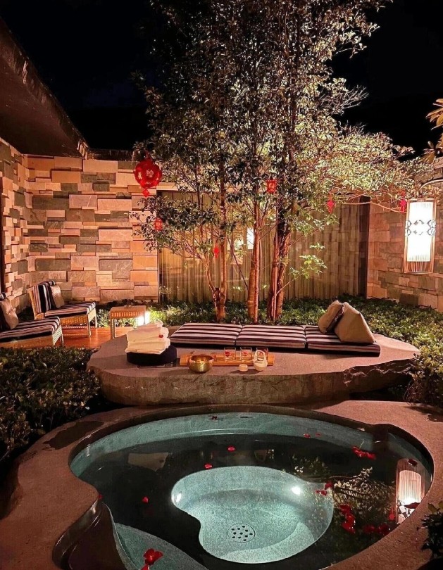 让我心心念念的是,这家酒店的温泉泡池是由一整块石头打磨而成的,质感独特,无法比拟。泡池和庭院的设计已经让我非常满意,但床垫的舒适度更是给了我一个惊喜。晚上抬头可以看到星空,配上迷你吧里的酒水,客厅里的背景音乐响起,整个画面就是惬意二字。