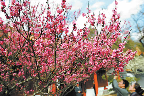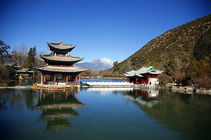丽江黑龙潭始建于乾隆二年(1737),其后乾隆六十年、光绪十八年均有重修记载。旧名玉泉龙王庙,因获清嘉庆、光绪两朝皇帝敕封“龙神”而得名,后改称黑龙潭。诗云:“泉涣涣兮涟漪,问何时最是可人?须领略月到天心,风来水面;亭标标而矗立黑龙潭公园,看这般无穷深致,应记取云飞画栋,雨卷珠帘。”黑龙潭以其天生丽质,名列《中国名泉》、《中国风景名胜》等书,诚不虚也。迎面见有一座涂金绘彩的牌楼,门口四尊石狮,肌理秀美,威武雄壮,过去守护木氏土司衙门,1966年迁此守护玉泉。进门往右,但见垂柳飘指,一潭澄碧,树底天光云影,树梢楼台隐现。沿潭右堤至锁翠桥,桥上古人有联云:“惊涛撼树飞晴雪,未雨垂虹卧曲波。”它生动地描绘了桥边景致。右边桥下三孔飞瀑,水花四溅,涛声如雷,流向古城,玉水河畔,杨柳依依,浓荫蔽日。往桥的左边黑龙潭公园看,一座五孔石拱桥,长虹卧波一般,将潭一分为二,玲珑俊美的一文亭、得月楼分别屹立内外潭心,四面临水,有桥与岸上相连。此楼始建于清光绪二年(1876年),楼名取自古人对联“近水楼台先得月、向阳花木早逢春”中三字。1963年重建时,郭沫若为该楼题写了匾额“得月楼”三字及两副对联。一副是集毛泽东诗词句: