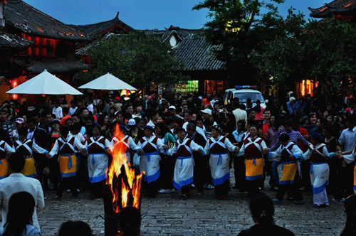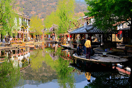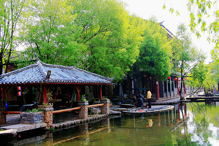 从丽江古城往北,沿中济海东侧的大路行约四公里,便见两边山脚下一片密集的村落,这就是被称为清泉之乡的束河古镇。当年徐霞客游芝山解脱林时,曾走过此道,在他的记述中这样写道:“过一枯涧石桥,西瞻中海,柳暗波萦,有大聚落临其上,是为十和院。”“十和”即今束河古镇之古称。历史开通于唐代的茶马古道,从滇南经丽江直达西藏拉萨,经唐、宋、元、明、清千余年的运营发展,促进了沿线各族人民的经济文化交流,束河即是丽江坝子中保存完好的驿站,1997年被列为“世界文化遗产”丽江古城的重要组成部分。