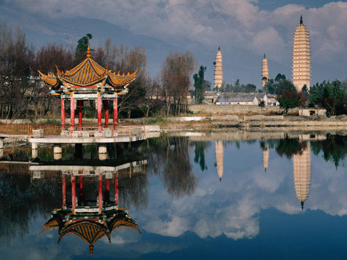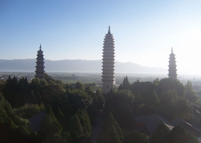 崇圣寺三塔始建于南诏王劝丰祐时期(公元824—859年),先建了大塔“千寻塔”,高69.13米,是座方形密檐式砖塔,共16层。稍后又建了南、北小塔,均高42.19米,是一对八角形的砖塔,都是10级。修建三塔,除了佛家所宣扬的可以成佛外,还有一个重要的原因,是大理古为“泽国多水患”。古籍《金石萃编》中记载:“世传龙性敬塔而畏鹏,大理旧为龙泽,故为此镇之。”相传古时修建三塔,采用垫一层土修一层塔的方法,塔修好以后,才将土逐层挖去,让塔显现出来,故有“堆土建塔”与“挖土现塔”之说。建塔时所搭的桥,高如山丘,长达10余里。修塔时运力不足,还用山羊来驮砖,如今大理的银桥村,古时称为“塔桥村”。古籍记载修三塔,“役工匠七百七十万,耗四万余金,历时八年建成”。修建三塔后,又建了规模弘大的崇圣寺。